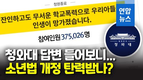 (서울=연합뉴스) 청와대는 10일 청소년들의 강력범죄를 예방하기 위해 소년범에 대한 형사 처벌을 강화하는 방안을 검토 중이라고 밝혔습니다.