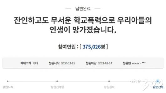 지난해 12월15일 청와대 국민청원 게시판엔 '잔인하고도 무서운 학교폭력으로 우리 아들의 인생이 망가졌습니다'란 제목의 국민 청원 글이 올라왔다. 한 달간 37만5026명의 동의를 받았다. 청원글 게시 하루 만에 청와대나 정부 관계자의 답변을 받을 수 있는 20만 이상으로부터 동의를 받으면서 많은 관심을 받았다.