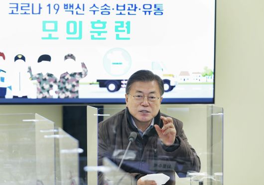문재인 대통령이 지난 3일 오전 인천국제공항 대한항공 화물터미널에서 열린 코로나19 백신 수송 모의훈련에서 변창흠 국토교통부 장관으로부터 훈련 상황에 대해 보고를 받은 뒤 발언하고 있다. /연합뉴스 |