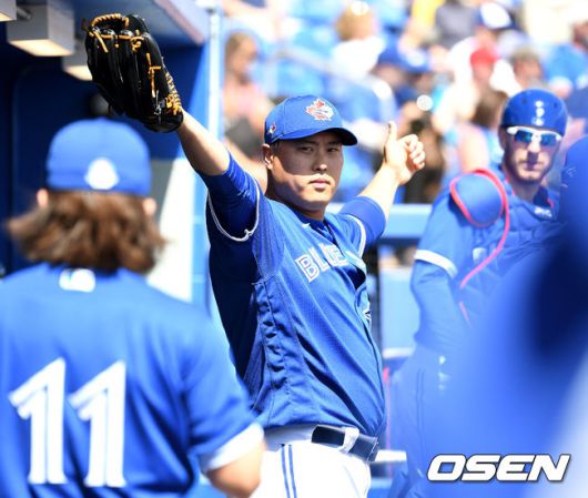 [OSEN=더니든(미국 플로리다주) ,최규한 기자]경기 시작을 앞두고 토론토 선발 류현진이 기지개를 켜고 있다. / dreamer@osen.co.kr |