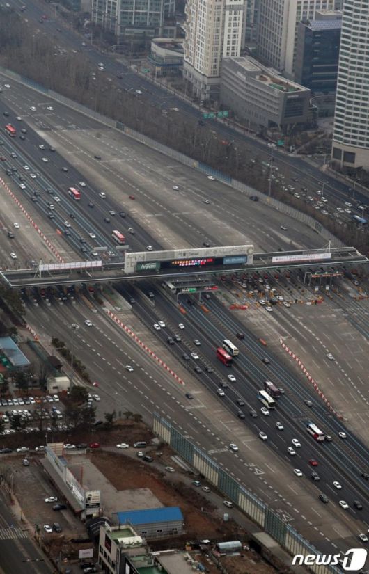 (서울=뉴스1) 황기선 기자 = 설 연휴를 하루 앞둔 10일 오후 경부 고속도로 서울 톨게이트에서 귀성길에 오른 차량들이 고향으로 향하고 있다. (항공촬영 협조 : 서울지방경찰청 항공대 이용길 경감, 심동국 경위) 2021.2.10/뉴스1 |