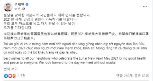 문 대통령은 12일 소셜네트워크서비스(SNS)를 통해 "설날을 맞이한 이웃나라 국민들께도 새해 인사를 전한다"며 "우리 모두 마스크를 벗고 다시 만날 수 있는 날이 오기를 기대한다"고 밝혔다.