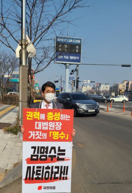 [아시아경제 박준이 기자] 국민의힘 소속 의원들이 설 연휴 전국 곳곳에서 '김명수 대법원장 탄핵'을 요구하며 릴레이 시위를 이어나가고 있다. 김 대법원장에 대한 탄핵 조치의 필요성을 강조하고 국민적 공감대를 형성하겠다는 목적에서다.