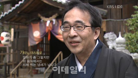 한국방송에서 제작한 다큐멘터리 슈퍼피쉬 등장한 오오하시 주민. 도죠스시에 대한 맛을 평가하고 있다.(사진=한국방송) |