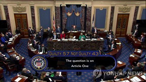 트럼프 '내란선동' 탄핵안 부결 알리는 TV 화면(워싱턴 로이터=연합뉴스) 13일(현지 시각) 도널드 트럼프 전 미국 대통령의 내란선동 혐의에 대한 상원의 탄핵심판 투표 결과가 상원TV 방송 화면에 비치고 있다. 상원은 이날 탄핵안 표결에서 유죄 57표, 무죄 43표로 트럼프 전 대통령에게 무죄를 선고했다. [미국 상원TV 제공. 판매 금지] leekm@yna.co.kr <저작권자(c) 연합뉴스, 무단 전재-재배포 금지>