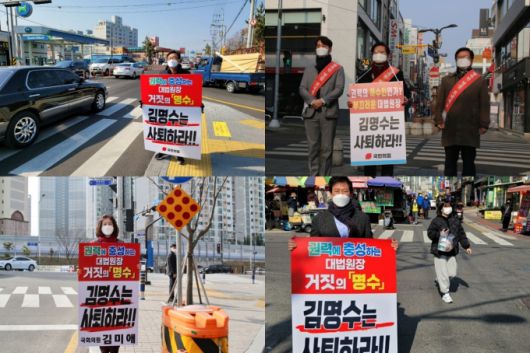 국민의힘은 연휴 내내 전국에서 김 대법원장의 사퇴를 촉구하는 1인 피켓시위를 펼쳤다. 지난 5일 서울 서초구 대법원 앞에서 시작한 릴레이 1인 시위를 전국에서 동시다발적으로 펼치는 방식으로 확대한 것이다. 당 소속 국회의원, 시군구 의원, 당협위원장 등이 시위에 동참했다. 전국적인 1인 시위를 통해 제1야당의 존재감을 알렸다는 평가다.