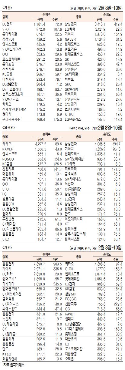 [표]주간 유가증권 기관·외국인·개인 순매수·도 상위종목(2월 8~10일)