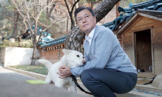 청와대가 12일 SNS를 통해 문재인 대통령이 청와대 관저에서 반려견과 함께하는 모습을 공개했다. 문 대통령은 고양이 찡찡이, 풍산개 마루와 곰이, 입양한 유기견 토리를 키우고 있다. 청와대 제공 |