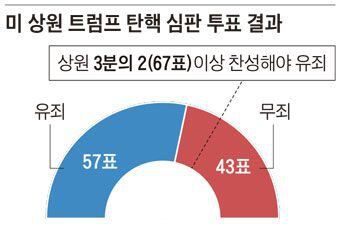 도널드 트럼프 전 미국 대통령에 대한 탄핵안이 미 상원에서 부결됐다. 연방 상원은 13일(현지 시각) 내란 선동 혐의를 받은 트럼프에 대한 탄핵안을 표결에 부쳐 찬성 57표, 반대 43표로 부결했다. 탄핵엔 상원의원 100명 중 3분의 2 인 67명 이상의 찬성이 필요한데 10표가 모자랐다. 이로써 지난달 6일 트럼프 대통령의 대선 불복 선동으로 그의 극렬 지지자들이 대선 결과를 인증하려던 의회에 난입해 폭동을 일으키고 5명이 숨진 사건은 39일 만에 트럼프에게 정치적 면죄부를 주는 것으로 종결됐다.
