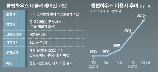 14일 시장조사업체 센서타워 등에 따르면 클럽하우스 앱 이용자는 2일 기준 360만 명이다. 이 중 110만 명은 가입한 지 6일 이내에 불과할 정도로 가입자 증가세가 최근 가팔라진 것으로 나타났다. 일부 외신은 13일(미국 시간) 기준 전 세계 가입자가 1000만 명을 넘어섰다고 추정하고 있다. 미국, 한국, 일본 등에서 클럽하우스가 인기를 끌면서 개발사 가치는 설립 10개월 만에 10억 달러를 넘어서며 유니콘(기업가치 10억 달러 이상 스타트업) 대열에 올랐다.