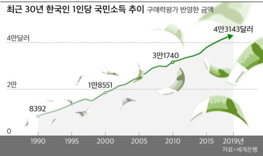 세계은행(WB)의 2019년 집계 기준으로 구매력 평가를 반영한 한국인의 1인당 국내총생산(GDP)은 4만3143달러(약 4800만원)다. 지난 30년 동안 1인당 국민소득이 4배 이상 늘었다. 10년 전인 2009년(2만9644달러)과 비교해도 50% 가까이 증가했다.