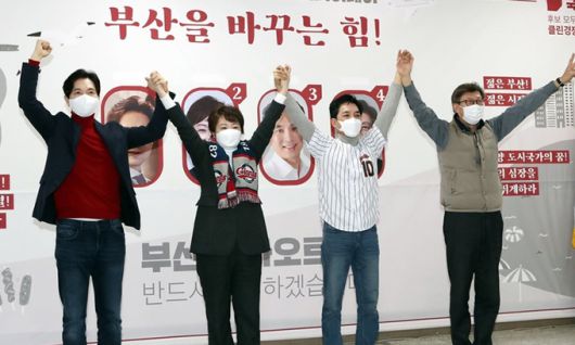 지난 7일 부산 수영구 국민의힘 부산시당에서 열린 미디어데이 행사에 참석한 부산시장 보궐선거 본경선 진출자 4명이 기호 추첨을 마친 뒤 기념촬영을 하고 있다. 왼쪽부터 1번 박성훈, 2번 이언주, 3번 박민식, 4번 박형준 예비후보. 연합뉴스 |