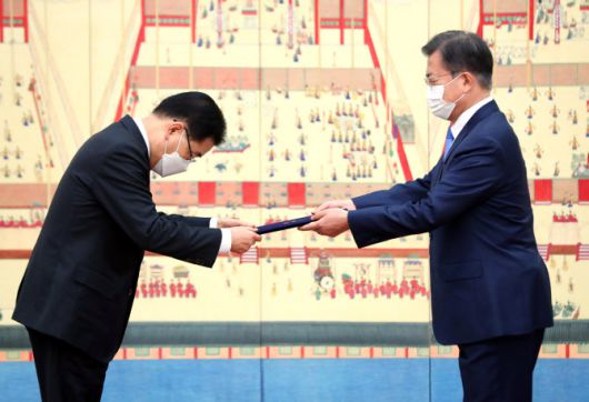 문재인 대통령이 15일 청와대에서 정의용 외교부 장관에게 임명장을 수여하고 있다.(사진=연합뉴스) |
