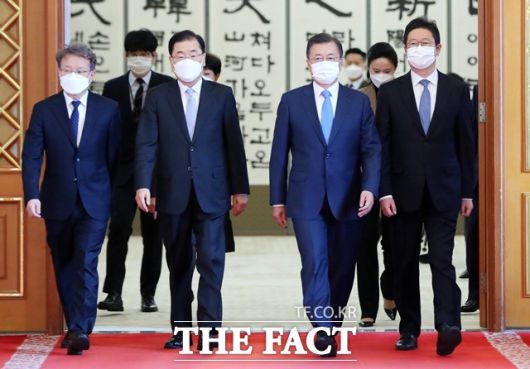 문재인 대통령이 15일 오전 청와대 본관에서 열린 신임 국무위원 임명장 수여식을 마친 후 신임 정의용 외교부 장관, 권칠승 중소벤처기업부 장관, 황희 문화체육관광부 장관과 함께 환담장으로 이동하고 있다. /뉴시스 |