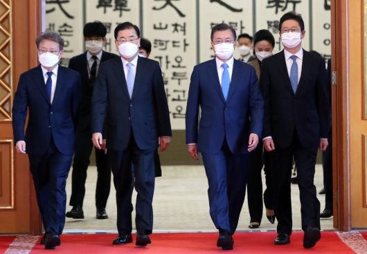 문재인 대통령이 15일 청와대에서 신임 국무위원 임명장 수여식을 마친 후 임명장을 받은 정의용 외교부 장관, 권칠승 중소벤처기업부 장관, 황희 문화체육관광부 장관 등과 환담장으로 이동하고 있다. [연합] |