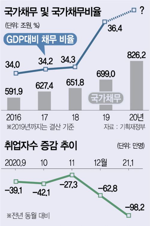 청와대에 일자리 현황판을 내걸고 ‘일자리 정부’를 내세웠지만 문재인 정부는 출범 이후 고용 문제를 돈으로 해결하기 위해 추경을 수차례 단행했다. 2017년 고용난 해소를 위해 11조 원 규모의 일자리 추경을, 2018년에는 청년 일자리 대책을 이유로 3조 8,317억 원의 추경을 편성했다. 코로나19 위기 극복을 위해 역대 최대 규모로 편성한 지난해 3차 추경에도 고용 및 사회 안전망 확충에 10조 원을 투입했다. 하지만 공공 근로뿐 아니라 도우미·서포터스 등의 명목으로 채용한 청년 인력들도 ‘단기 알바’ 성격에 가깝다는 비판이 거셌다. 여기다 여전히 고용 문제의 원인조차 제대로 진단하지 못한다는 지적도 나온다. 1월 고용 쇼크는 코로나19로 인해 전년에 집행됐던 노인 일자리 등이 중단된 데 따른 기저 효과의 영향이 크지만 문 대통령은 문제의 원인을 '세금 일자리' 감소가 아닌 코로나19 확산에 따른 비대면 경제 활성화에서 찾았기 때문이다.