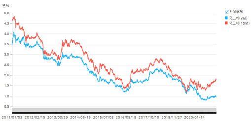 국고채 10년물, 3년물 금리 변동 추이. (자료=한국은행경제통계시스템) |