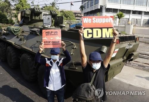 시위대는 양곤 시내 주요 도로에 배치된 장갑차 앞과 뒤에서 '우리는 쿠데타를 인정하지 않는다', '우리는 시민불복종을 지지한다' 등의 영문이 적힌 플래카드를 들고 시위를 벌였다.