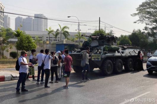 [양곤=AP/뉴시스]15일 미얀마 양곤의 중앙은행 밖에 배치된 장갑차 앞에 군부 쿠데타 반대 시위대가 모여 있다. 미얀마 전역에서 군부 쿠데타에 항의하는 시위가 9일째 이어진 가운데 군부가 시위 중심지인 최대 도시 양곤으로 군 병력을 이동해 시위에 강경 대응을 준비하는 것 아니냐는 관측이 나오고 있다. 2021.02.15. |