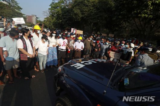 [양곤=AP/뉴시스]15일 미얀마 양곤에서 반쿠데타 시위대가 경찰차를 가로막고 있다. 2021.02.15. |