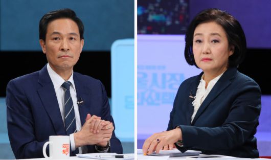 더불어민주당 박영선(오른쪽), 우상호 서울시장 경선후보가 15일 서울 마포구 상암동 MBC에서 열린 ‘100분 토론’에서 더불민주당 서울시장 후보 경선 토론을 하고 있다. (사진=연합뉴스) |