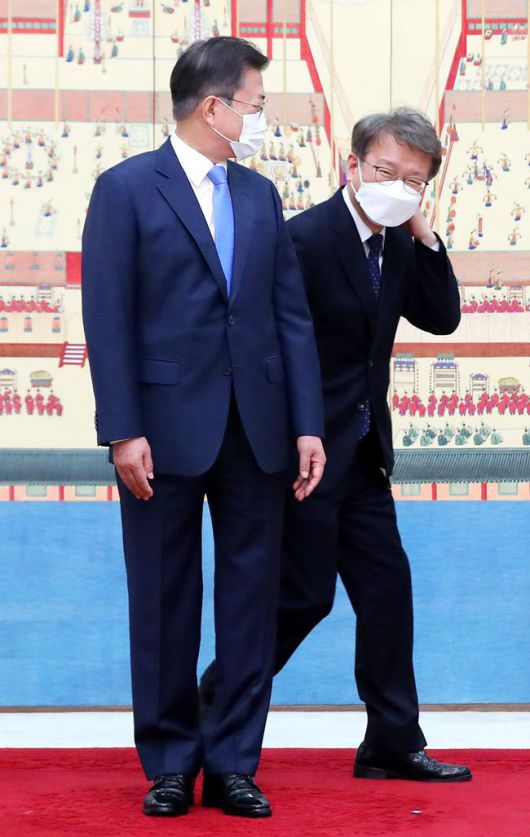 /연합뉴스 문재인 대통령이 15일 청와대에서 권칠승 중소벤처기업부 장관에게 임명장을 수여했다. 사진은 권 장관이 임명식 기념사진 촬영을 위해 문 대통령 옆자리로 가는 모습.- Copyrights ⓒ 조선일보 & chosun.com, 무단 전재 및 재배포 금지 -