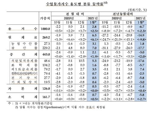 하지만 1월 수입물가지수를 전년 같은 달과 비교하면 여전히 6.7% 낮은 수준이다.