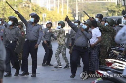 쿠데타를 일으킨 미얀마 군부가 반군부독재 시위대에게 총을 겨누고, 곤봉과 새총을 이용한 강경진압에 나섰다.