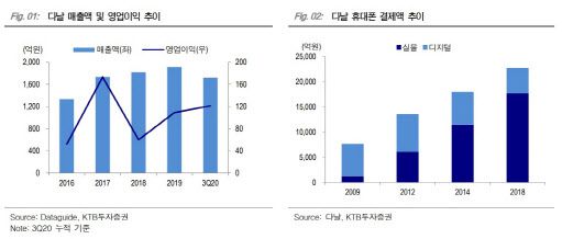 실제로 이러한 코로나19 수혜 덕에 다날은 지난해 3분기까지 누적 매출액 1717억원, 영업이익 121억원을 기록했다. 이는 전년 동기 대비 각각 20.5%, 5.2% 늘어난 수치다.