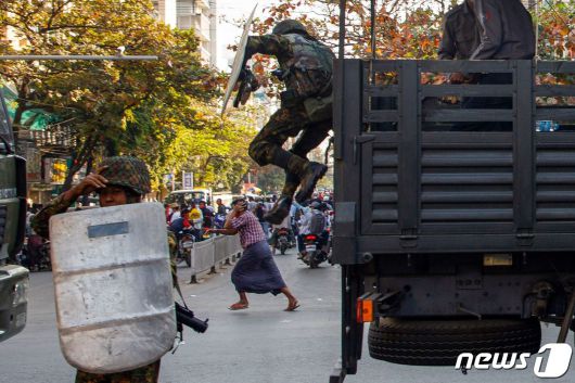15일(현지시간) 미얀마의 제2도시 만달레이의 군부 쿠데타 반대 시위대 현장에서 한 군인이 시위 진압을 위해 군용 차량에서 뛰어내리고 있다. 통신은 현지 매체를 인용해 전날 양곤 시내에 쿠데타 발생 이후 처음으로 장갑차들이 등장, 경찰이 시위대에 소총을 겨눈 가운데 총소리가 나며 여러 명이 다쳤다고 보도했다. © AFP=뉴스1 |