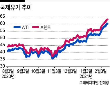두바이유 기준 국제 유가가 1월 평균 배럴당 54.82달러로 1개월 새 10% 뛴 영향이다. 원재료 중 광산품(7.0%), 중간재 중 석탄·석유제품(5.3%)의 상승 폭도 컸다. 농림수산품도 3.1% 올랐다.