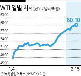 최근 급등중인 국제유가는 코로나19 이전 수준으로 회복됐다. 15일(현지시간) 뉴욕상업거래소(NYMEX)에서 3월 인도분 서부 텍사스산 원유(WTI)는 배럴당 1.1%(0.63달러) 오른 60.10달러에 거래를 마쳤다. 60달러 돌파는 13개월 만으로, 지난해 1월8일 이후 최고가다.