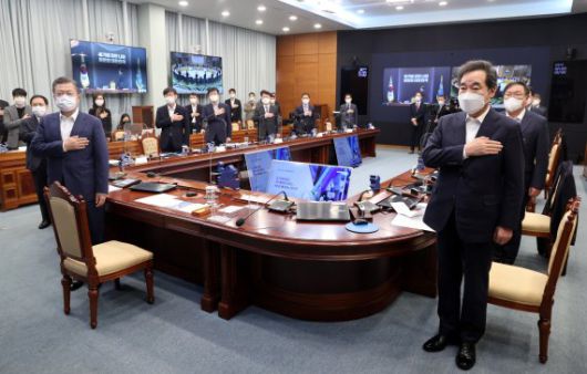 문재인 대통령과 이낙연 더불어민주당 대표가 지난 16일 오후 청와대에서 화상회의 형식으로 열린 국토교통부 2021년 업무보고에 참석해 국민의례를 하고 있다. 사진=뉴시스화상 |