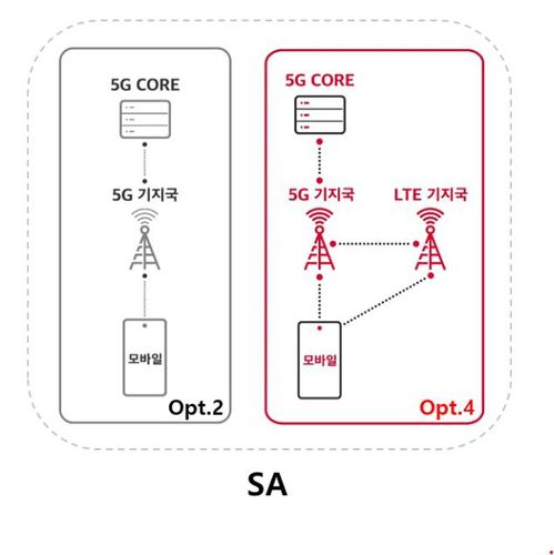 5G 옵션4는 5G 코어·기지국 장비만 이용하는 현재 SA 기술인 '옵션2'에서 한 단계 나아간 기술로, 5G와 LTE를 결합해 최고 속도를 높이는 게 특징이다. 현재 전 세계 통신사 중 일부가 상용화한 5G SA 기술인 옵션2는 LTE 결합 없이 5G 네트워크만 활용할 수 있어 비단독모드(NSA) 기술 대비 속도, 품질이 떨어진다.