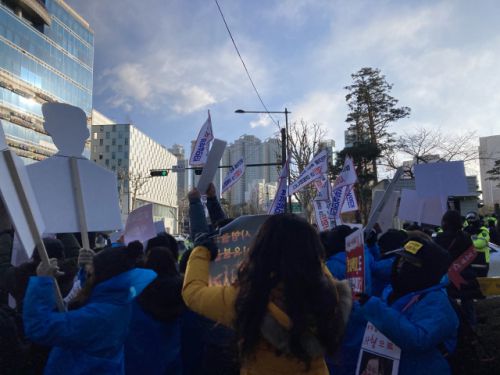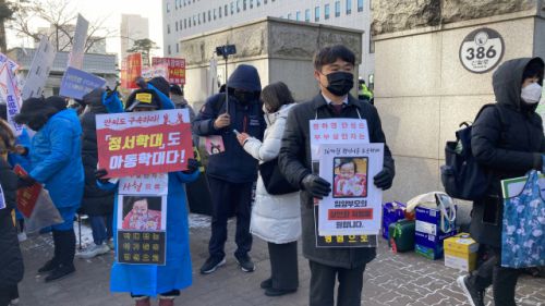 이날 시민단체 대한아동학대방지협회 회원들 10여 명은 오전 6시부터 서울 남부지법 앞에 도착해 시위를 펼쳤다. 이들은 파란색 우비를 입고 '양부 구속·아동학대 살인자 장하영' '살아서는 사형을, 죽어서는 지옥불' 등의 문구가 적힌 피켓을 들었다. 회원들은 법원 정문 게시판 앞에 '아동권리협약의 기본 원칙' 및 '모든 어린이가 마땅히 누려야 할 권리'가 적혀 있는 포스터 2장도 걸었다.