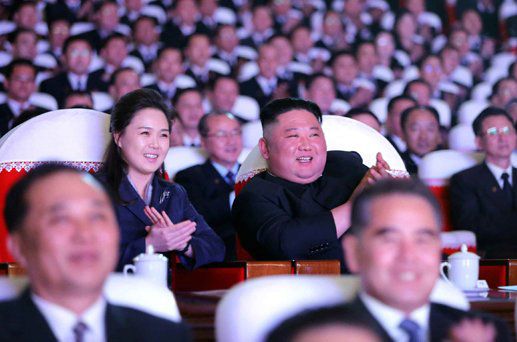 공개된 사진속에 김정은 위원장 내외가 웃으며 공연을 관람하고 있다. 노동신문=연합뉴스 |