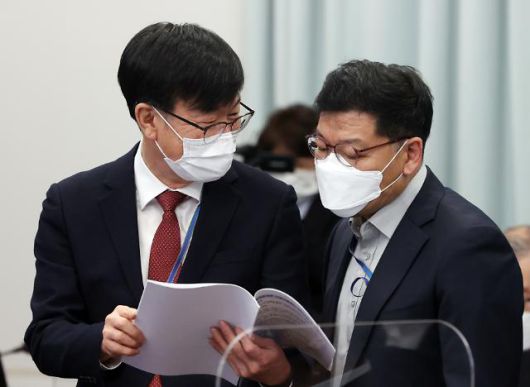 이정동 특보와 대화하는 김상조 정책실장 (서울=연합뉴스) 최재구 기자 = 김상조 대통령비서실 정책실장(왼쪽)이 15일 청와대에서 열린 수석·보좌관 회의에 참석해 회의 전 이정동 경제과학특별보좌관과 대화하고 있다. 2021.2.15 jjaeck9@yna.co.kr/2021-02-15 14:43:51/ <저작권자 ⓒ 1980-2021 ㈜연합뉴스. 무단 전재 재배포 금지.> |