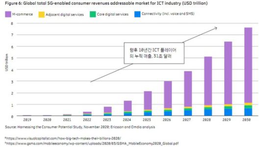 31조 달러 중 통신사는 연간 7120억달러 등 2030년까지 3.7조 달러의 누적 5G 수익을 확보할 수 있을 것으로 예측됐다. 이는 동영상 등 다양한 디지털 서비스들이 더 높은 요금제로의 업그레이드를 유도하기 때문이다.