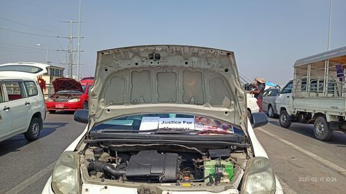 양곤에서 '고장난 차 버려두기 운동'에 참여한 차량. 후드가 열려있고 쿠데타 규탄 팻말이 유리창 앞에 끼워져 있다. 2021.2.17 [미얀마 나우 캡처. 재판매 미 DB 금지] |