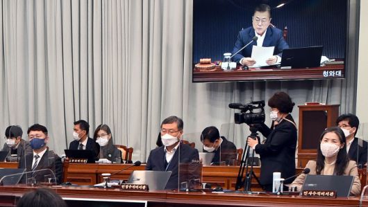 국무회의 참석한 신 수석 문재인 대통령이 지난 16일 청와대에서 열린 국무회의에서 모두발언을 하고 있는 가운데 사의를 표명한 신현수 청와대 민정수석(앞줄 가운데)이 회의장에 앉아 있다. 청와대사진기자단 |