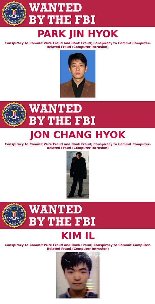 작년 12월에 제출된 공소장에 따르면 기소된 해커는 박진혁, 전창혁, 김일이라는 이름을 쓰고 있으며 북한군 정보기관인 정찰총국 소속입니다.