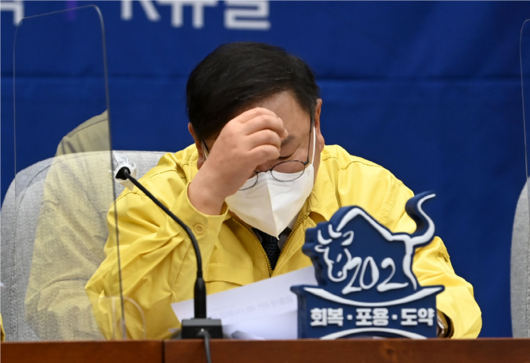 더불어민주당 김태년 원내대표가 18일 오전 국회에서 열린 정책조정회의에서 생각에 잠겨 있다. (연합뉴스) |