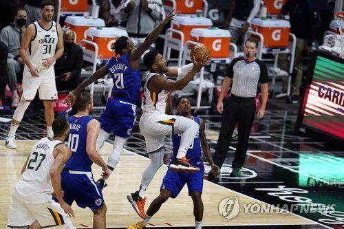 유타는 18일(한국시간) 미국 캘리포니아주 로스앤젤레스의 스테이플스 센터에서 열린 2020-2021 NBA 정규리그 LA 클리퍼스와 원정 경기에서 114-96으로 이겼다.