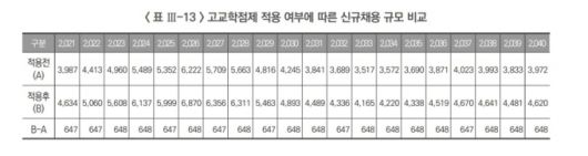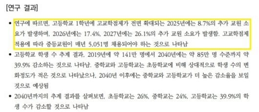 연구진은 이를 적용했을 경우 2040년에 10만1325명의 필요 교원이 발생할 것으로 전망했다. 이는 고교학점제 적용 전인 8만365명보다 2만960명 늘어난 수치다.