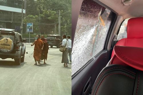 승려복 차림 남성들에 공격 당해 차량유리가 깨졌다며 네티즌이 올린 사진. |