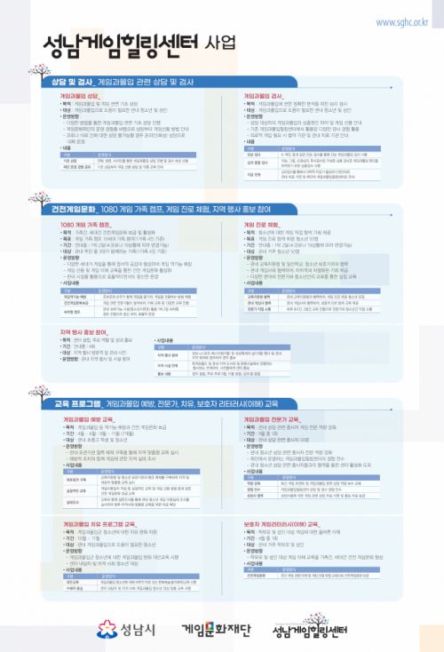 성남게임힐링센터는 상담실과 가상현실(VR) 체험관을 갖춰 전국 최초의 게임 과몰입 예방 프로그램을 운영한다. 특히 시민 대상 게임 과몰입 정도 검사와 예방 상담, 게임 이해하기 교육, 게임 과몰입 치유를 위한 음악, 체육 등의 문화예술 프로그램 등도 진행한다.