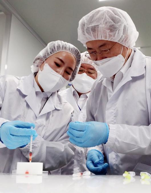 문 대통령은 "우리 중소기업 풍림파마텍과 신아양행, 두원메디텍이 그 자랑스러운 역할을 하고 있다"며 "진단키트에 이어 K-방역의 우수성을 또 한번 보여주게 되었다"고 노력을 치하했다.