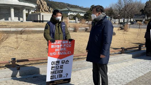 [이데일리 권오석 기자] 최승재 국민의힘 의원이 18일 청와대 분수대 앞에서 릴레이 1인 시위를 하고 있는 코로나19 피해 소상공인을 만나 격려하고 애로사항을 청취했다고 밝혔다.