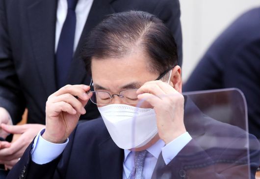 정의용 외교부 장관이 18일 오후 서울 여의도 국회에서 열린 외교통일위원회 전체회의에서 안경을 고쳐쓰고 있다. /사진공동취재단 |