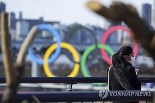 (도쿄 AP=연합뉴스) 18일 일본 도쿄도(東京都)의 한 공원에서 마스크를 쓴 여성이 이동하고 있다. 신종 코로나바이러스 감염증(코로나19) 확산으로 도쿄 올림픽·패럴림픽이 개최될 수 있을지 불투명한 가운데 해상에 설치된 오륜 조형물이 보인다. |